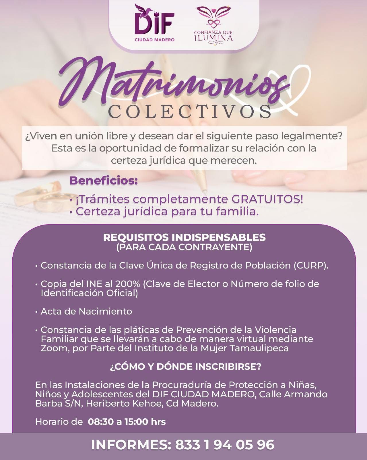 La recepción de documentos se realiza en las instalaciones de la Procuraduría de Protección a Niñas, Niños y Adolescentes del DIF Ciudad Madero, ubicadas en calle Armando Barba S/N, colonia Heriberto Kehoe, en horario de 8:30 a 15:00 horas. Para mayores informes, las parejas pueden comunicarse al teléfono 833 1 94 05 96.