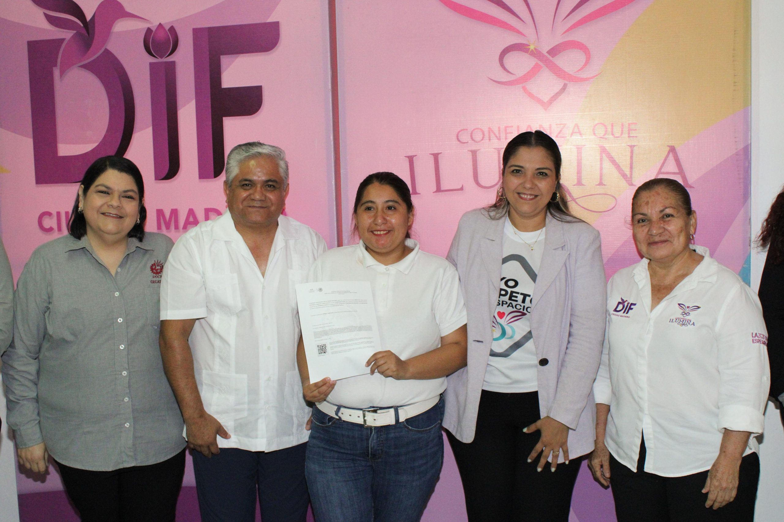 Con el firme propósito de seguir abriendo oportunidades para las personas con discapacidad, el Sistema DIF Ciudad Madero, que encabeza su Presidenta, Lic. Dunia Marón Acuña, y el CECATI 110 llevaron a cabo la entrega de constancias de los cursos de capacitación para inclusión laboral, en los que participaron 24 alumnas y alumnos que concluyeron su formación como Auxiliares Administrativos y Operadores de Call Center.