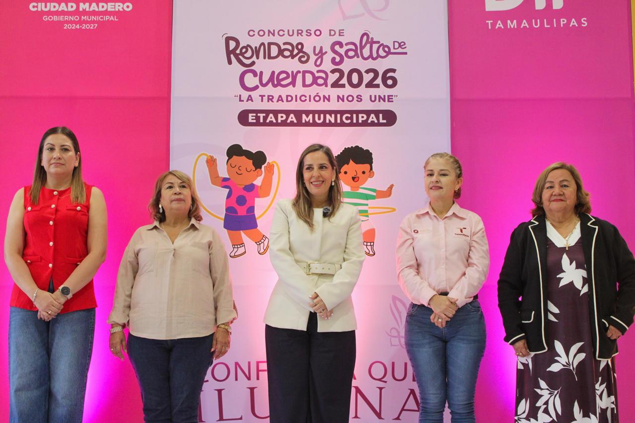 La Presidenta del Sistema DIF Ciudad Madero, Lic. Dunia Marón Acuña, encabezó el inicio del Concurso Municipal de Rondas y Saltos de Cuerda 2026 “La Tradición Nos Une”, que se llevó a cabo en el Auditorio Municipal “Américo Villarreal Guerra”, actividad impulsada por el DIF Tamaulipas -que encabeza la Dra. María Santiago de Villarreal- y que promueve la convivencia escolar, la actividad física y el rescate de juegos tradicionales entre niñas y niños del municipio.